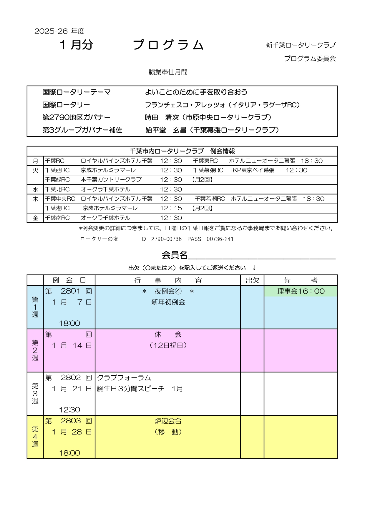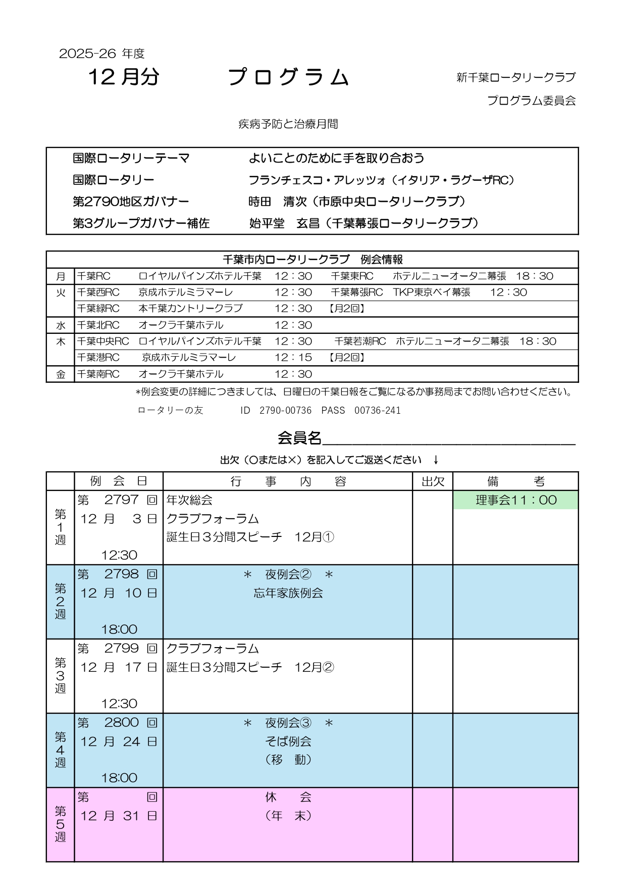 各RCとも、行事等により例会場、例会開催日時が変更になることがあります。