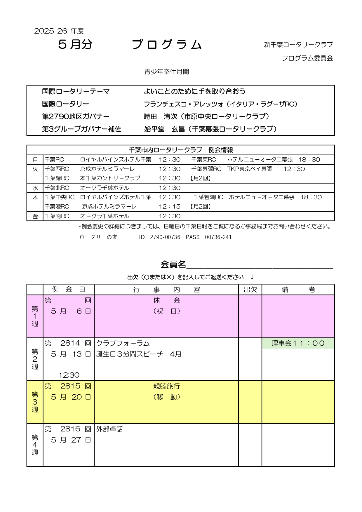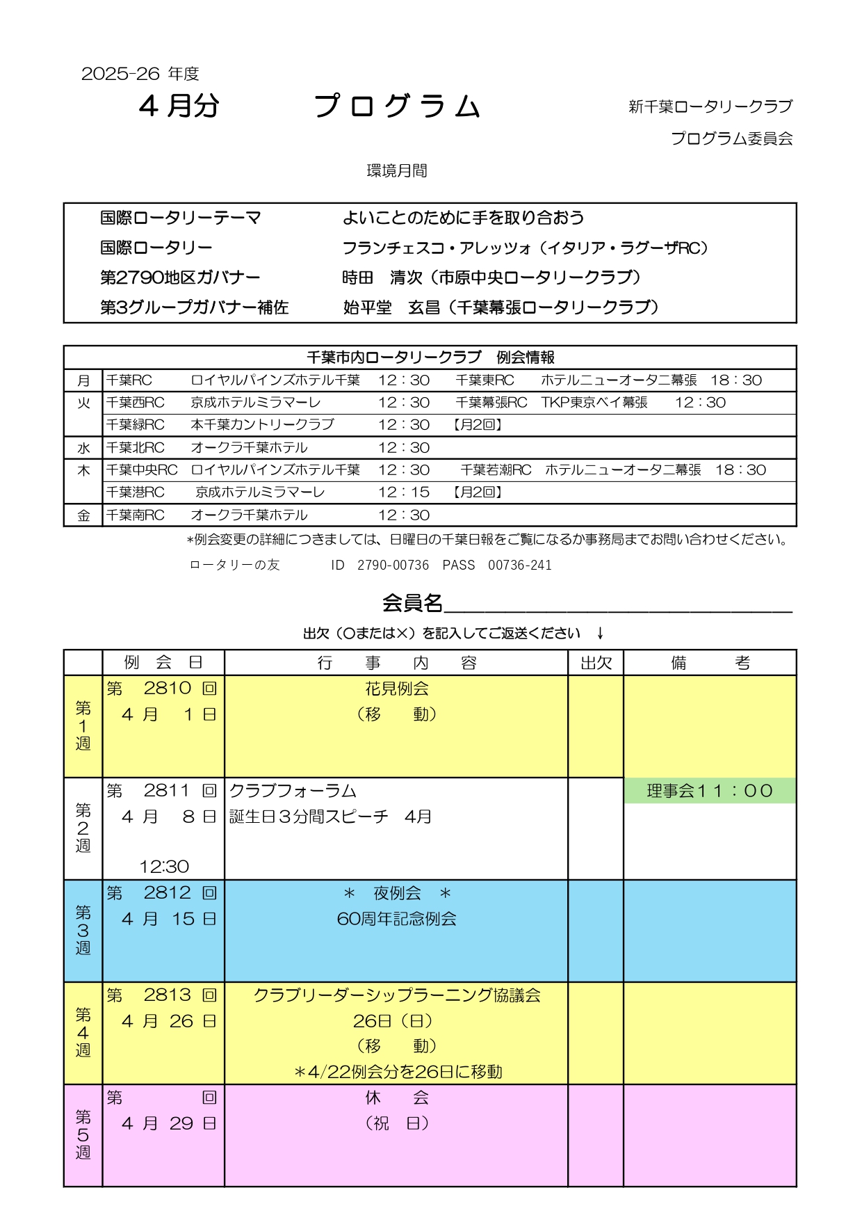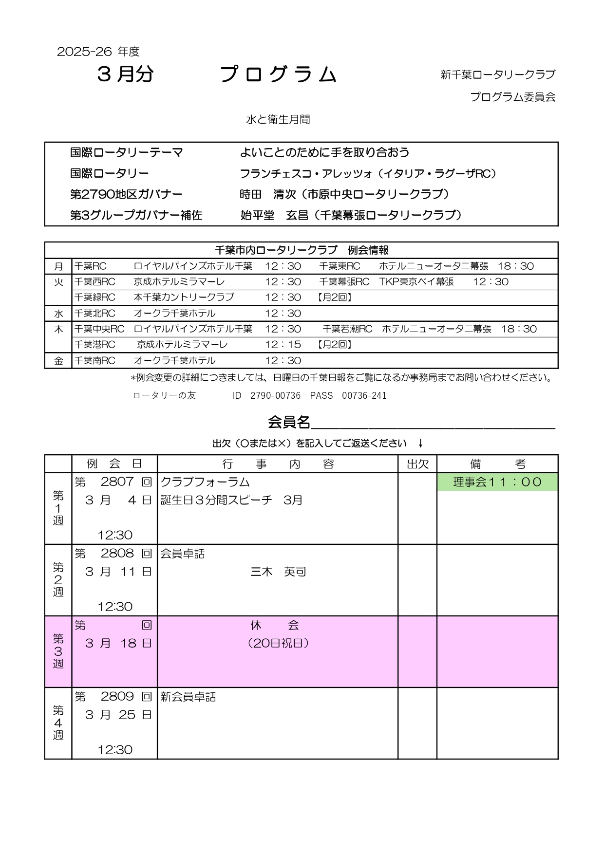 この場合でも、定例の開催場所・時間に受付がでていますので、署名するとメークアップとなります。